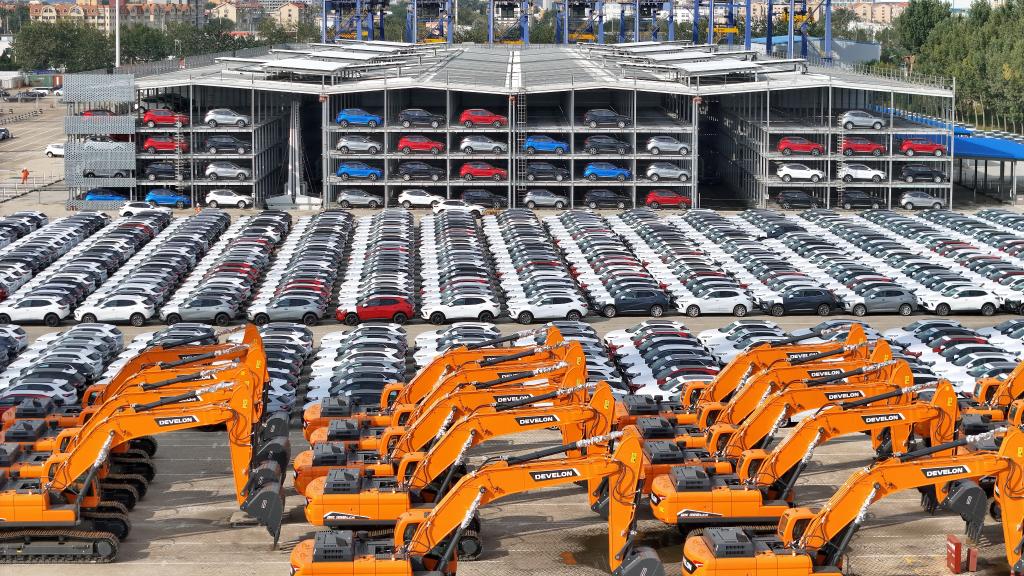 国产汽车和工程机械在山东港口烟台港集结等待装船出口。(图/新华社)